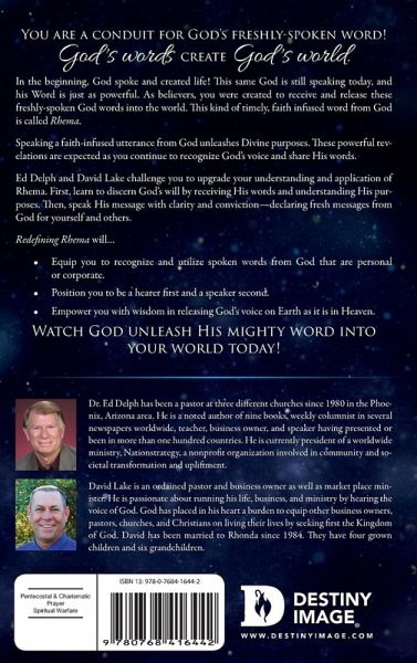 Release God's Word Through Declaration! Fear and anxiety may darken our lives, but God offers a supernatural solution: His freshly spoken word. Ed Delph and David Lake invite you to experience the voice of God in a new way. Through their revelatory three-step approach, you will learn how to hear the freshly spoken, Rhema word from God, and speak forth what He is saying. This kind of confident prayer produces power and results! You can break through darkness in the same way that God's spoken word created light and order in Genesis 1. Declaration releases supernatural creative power, and this power is available to every Christian! But before you can declare the word of God, you must first hear the Rhema of God. Redefining Rhema is a prophetic blueprint that will: * Position you to clearly hear freshly spoken words from God * Show you how to speak to God with the assurance that He is listening * Empower you to release God's voice on Earth through transformational declarations, prayers, and actions Speak God's word, and see the darkness dispelled!