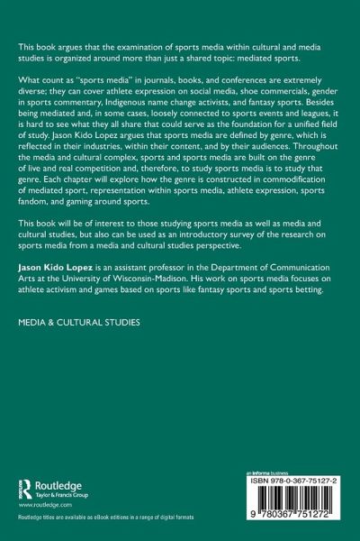 What count as "sports media" in journals, books, and conferences are extremely diverse; they can cover athlete expression on social media, shoe commercials, gender in sports commentary, Indigenous name change activists, and fantasy sports. Besides being mediated and, in some cases, loosely connected to sports events and leagues, it is hard to see what they all share that could serve as the foundation for a unified field of study. Jason Kido Lopez argues that sports media are defined by genre, which is reflected in their industries, within their content, and by their audiences. Throughout the media and cultural complex, sports and sports media are built on the genre of live and real competition and, therefore, to study sports media is to study that genre. Each chapter will explore how the genre is constructed in commodification of mediated sport, representation within sports media, athlete expression, sports fandom, and gaming around sports.