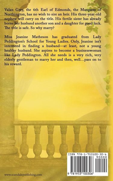 Valan Grey, the 6th Earl of Edmonds, the Marquess of Northington, has no wish to sire an heir. His three-year-old nephew will carry on the title. His fertile sister has already borne her husband another son and a daughter for good luck. The title is safe. So why marry? Miss Jeanine Matheson has graduated from Lady Peddington's School for Young Ladies. Only, Jeanine isn't interested in finding a husband-at least, not a young healthy husband. She aspires to become a businesswoman like Lady Peddington. All she needs is a very rich, very elderly gentleman to marry her and then, well...pass on to his reward.