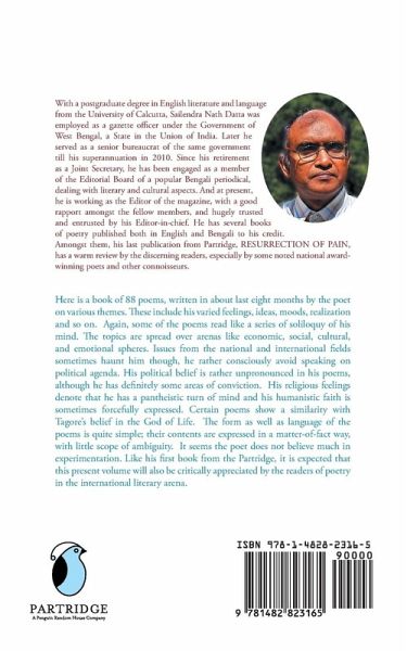 Here is a book of 88 poems, written in about last eight months by the poet on various themes. These include his varied feelings, ideas, moods, realization and so on. Again, some of the poems read like a series of soliloquy of his mind. The topics are spread over arenas like economic, social, cultural, and emotional spheres. Issues from the national and international fields sometimes haunt him though, he rather consciously avoid speaking on political agenda. His political belief is rather unpronounced in his poems, although he has definitely some areas of conviction. His religious feelings denote that he has a pantheistic turn of mind and his humanistic faith is sometimes forcefully expressed. Certain poems show a similarity with Tagore's belief in the God of Life. The form as well as language of the poems is quite simple; their contents are expressed in a matter-of-fact way, with little scope of ambiguity. It seems the poet does not believe much in experimentation. Like his first book from the Partridge, it is expected that this present volume will also be critically appreciated by the readers of poetry in the international literary arena.
