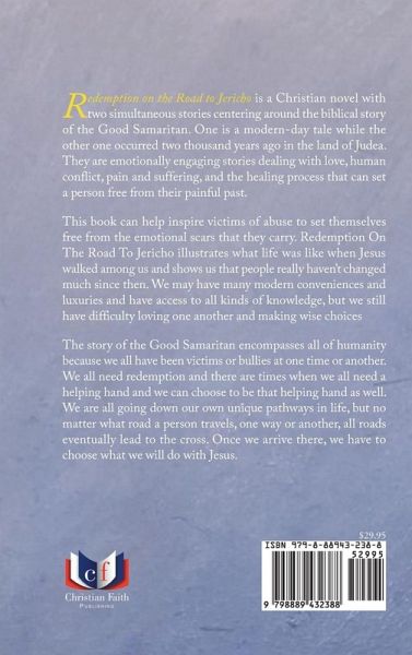 Redemption on the Road to Jericho is a Christian novel with two simultaneous stories centering around the biblical story of the Good Samaritan. One is a modern-day tale while the other one occurred two thousand years ago in the land of Judea. They are emotionally engaging stories dealing with love, human conflict, pain and suffering, and the healing process that can set a person free from their painful past. It is possible that this book can inspire victims of abuse to set themselves free from the emotional scars that they carry. This book illustrates how life was like when Jesus walked among us and shows that people really haven't changed all that much since then. We may have many modern conveniences and luxuries and have access to all kinds of knowledge, but we still have difficulty loving one another and making wise choices. The story of the Good Samaritan encompasses all of humanity because we have all been victims or bullies at one time or another. We all need redemption and we all need a helping hand at one time or another, and we can choose to be that helping hand as well. We are all going down our own unique pathways in life, but no matter what road a person travels, one way or another, all roads eventually lead to the cross. Once we arrive there, we have to choose what we will do with Jesus.