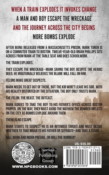 WHEN A TRAIN EXPLODES, IT INVOKES CHANGE A MAN AND BOY ESCAPE THE WRECKAGE AND THE JOURNEY ACROSS THE CITY BEGINS MORE BOMB EXPLODE After being released from a Massachusetts prison, Mark Toren is on a commuter train to Boston. Twelve-year-old Brian Phillips sits across from Mark at the table seat and does schoolwork. The train explodes. They escape the wreckage-Mark saving the boy. Despite the heroic deed, he irrationally believes the blame will fall on him. Felons make great suspects. Mark needs to get out of there, but the kid won't leave his side. With his reality distorted by the situation, the boy only trusts Mark. The felon. The beast. The outcast. Mark Agrees to take the boy to his father's office across Boston proper. On the way, they must avoid the mayhem the bomber inflicts on the city as bombs explode around them. There is no escape. Mark starts to suspect he is an intended target and must decide whether to take Brian to his father or separate-and take a stand.