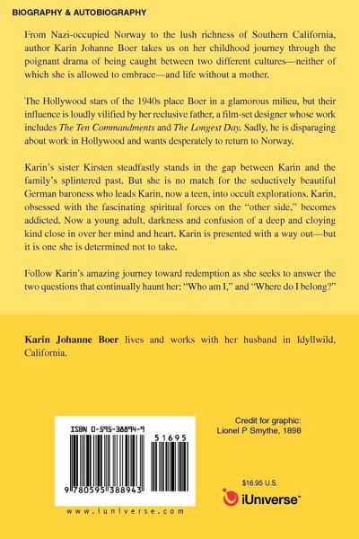 From Nazi-occupied Norway to the lush richness of Southern California, author Karin Johanne Boer takes us on her childhood journey through the poignant drama of being caught between two different cultures-neither of which she is allowed to embrace-and life without a mother. The Hollywood stars of the 1940s place Boer in a glamorous milieu, but their influence is loudly vilified by her reclusive father, a film-set designer whose work includes The Ten Commandments and The Longest Day Sadly, he is disparaging about work in Hollywood and wants desperately to return to Norway. Karin's sister, Kirsten, steadfastly stands in the gap between Karin and the family's splintered past. But she is no match for the seductively beautiful German baroness who leads Karin, now a teen, into occult explorations. Karin, obsessed with the fascinating spiritual forces on the "other side," becomes addicted. Now a young adult, darkness and confusion of a deep and cloying kind close in over her mind and heart. Karin is presented with a way out-but it is one she is determined not to take. Follow Karin's amazing journey toward redemption as she seeks to answer the two questions that continually haunt her: "Who am I, and where do I belong?"
