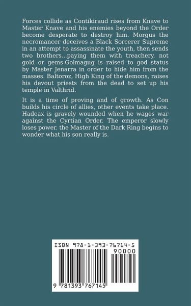 Forces collide as Contikiraud rises from Knave to Master Knave and his enemies beyond the Order become desperate to destroy him. Morgus the necromancer deceives a Black Sorcerer Supreme in an attempt to assassinate the youth, then sends two brothers...paying them with treachery, not gold or gems.Golmagug is raised to god status by Master Jenarra in order to hide him from the masses. Baltoroz, High King of the demons, raises his devout priests from the dead to set up his temple in Valthrid. It is a time of proving and of growth. As Con builds his circle of allies, other events take place. Hadeax is gravely wounded when he wages war against the Cyrtian Order. The emperor slowly loses power. the Master of the Dark Ring begins to wonder what his son really is.