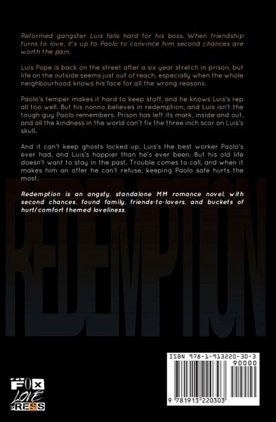 Reformed gangster Luis falls hard for his boss. When friendship turns to love, it's up to Paolo to convince him second chances are worth the pain. Luis Pope is back on the street after a six year stretch in prison, but life on the outside seems just out of reach, especially when the whole neighbourhood knows his face for all the wrong reasons. Paolo's temper makes it hard to keep staff, and he knows Luis's rep all too well. But his nonno believes in redemption, and Luis isn't the tough guy Paolo remembers. Prison has left its mark, inside and out, and all the kindness in the world can't fix the three inch scar on Luis's skull. And it can't keep ghosts locked up. Luis's the best worker Paolo's ever had, and Luis's happier than he's ever been. But his old life doesn't want to stay in the past. Trouble comes to call, and when it makes him an offer he can't refuse, keeping Paolo safe hurts the most. Redemption is an angsty, standalone MM romance novel, with second chances, found family, friends-to-lovers, and buckets of hurt/comfort themed loveliness.