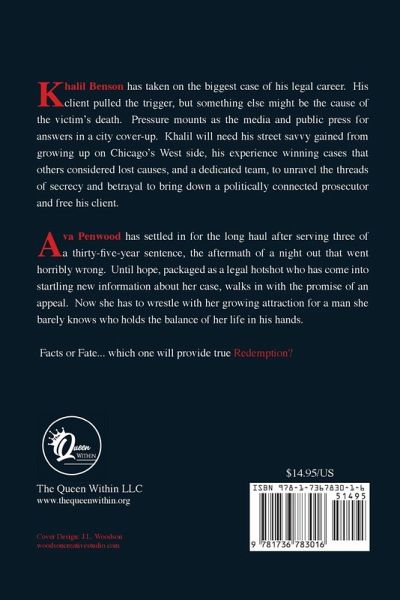 Khalil Benson has taken on the biggest case of his legal career. His client pulled the trigger, but something else might be the cause of the victim's death. Pressure mounts as the media and public press for answers in a city cover-up. Khalil will need his street savvy gained from growing up on Chicago's West side, his experience winning cases that others considered lost causes, and a dedicated team, to unravel the threads of secrecy and betrayal to bring down a politically connected prosecutor and free his client. Ava Penwood has settled in for the long haul after serving three of a thirty-five-year sentence, the aftermath of a night out that went horribly wrong. Until hope, packaged as a legal hotshot who has come into startling new information about her case, walks in with the promise of an appeal. Now she has to wrestle with her growing attraction for a man she barely knows who holds the balance of her life in his hands. Facts or Fate... which one will provide true Redemption?