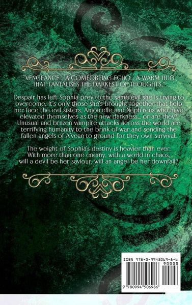 "Vengeance...a comforting echo...a warm hug that tantalised the darkest of thoughts." Despair has left Sophia prey to the same evil she is trying to overcome. It's only those she's brought together that help her face the evil sisters, Anjou'elle and Neph'reus who have elevated themselves as the new darkness... or are they? Unusual and brazen vampire attacks across the world are terrifying humanity to the brink of war and sending the fallen angels of A'vean to ground for their own survival. The weight of Sophia's destiny is heavier than ever. With more than one enemy, with a world in chaos, will a devil be her saviour, will an angel be her downfall?