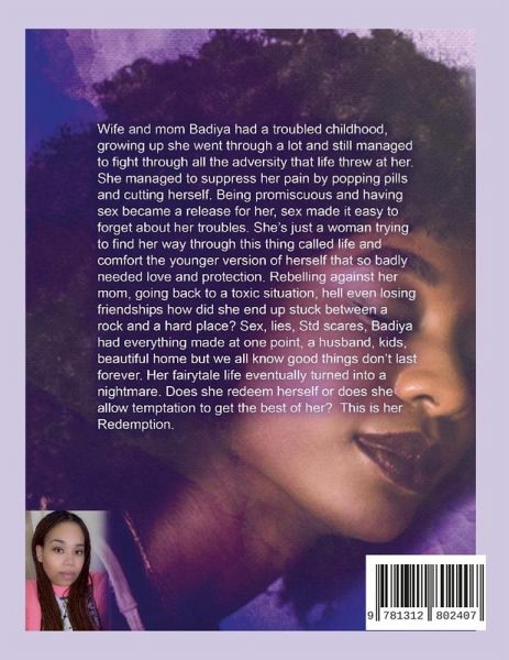 Wife and mom Badiya had a troubled childhood, growing up she went through a-lot. She managed to fight adversity that life threw at her. She managed to surpress her pain by popping pills, and cutting herself. Being promiscious and having sex became her outlet of release. Sex made it easy to forget about her troubles. She's just a woman trying to find her way through this thing called life while comforting the younger version of herself that so badly needed love and protection. Rebelling against her mom, going back to toxic situations, hell even loosing friendships. How did she end up stuck between a rock and a hard place? Sex, lies, std scares, Badiya had everything made at one point. A husband, kids, and a beautiful home, but we all know how good things don't last forever. Her fairytale life eventually turned into a nightmare. Does she redeem herself or does she allow temptation to get the best of her? This is her Redemption.