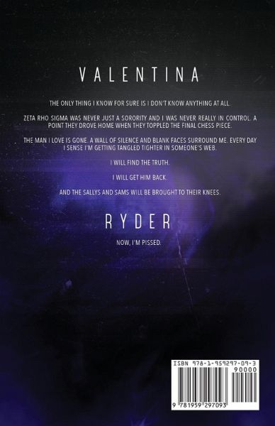Valentina The only thing I know for sure is I don't know anything at all. Zeta Rho Sigma was never just a sorority and I was never really in control. A point they drove home when they toppled the final chess piece. The man I love is gone. A wall of silence and blank faces surround me. Every day I sense I'm getting tangled tighter in someone's web. I will find the truth. I will get him back. And the Sallys and Sams will be brought to their knees. Ryder Now, I'm pissed