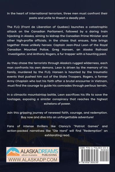 In the heart of international terrorism, three men must confront their pasts and unite to thwart a deadly plot. The FLQ (Front de Liberation of Quebec launches a catastrophic attack on the Canadian Parliament, followed by a daring train hijacking in Alaska, aiming to kidnap the Canadian Prime Minister and other high-profile officials. In the chaos that ensues, fate brings together three unlikely heroes: Captain Jean-Paul Leon of the Royal Canadian Mounted Police, Greg Hansen, an Alaska Railroad Investigator, and Anthony Rogers, a fur trapper with a haunting past. As they chase the terrorists through Alaska's rugged wilderness, each man confronts his own demons. Leon is driven by the memory of his family, murdered by the FLQ. Hansen is haunted by the traumatic events that pushed him out of the State Troopers. Rogers, a former Army Chaplain who lost his faith after a brutal encounter in Vietnam, must find the courage to guide his comrades through perilous terrain. In a climactic mountaintop battle, Leon sacrifices his life to save the hostages, exposing a sinister conspiracy that reaches the highest echelons of power. Join this gripping journey of renewed faith, courage, and redemption. Buy now and dive into an unforgettable adventure! Fans of intense thrillers like Clancy's "Patriot Games" and action-packed narratives like "Die Hard" will find "Redemption" an exhilarating read.