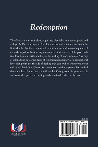 The Christian journey is always a journey of pitfalls, mountains, peaks, and valleys. As Tim continues to find his way through these narrow roads, he finds that his family is connected to another. An unforeseen sequence of events brings three families together, reveals hidden secrets of the past, finds true love here on Earth, and begins the healing of many wounds. A voyage of astonishing outcomes, tears of remembrance, displays of unconditional love, along with the threads of healing that come when we surrender our will to our Lord Jesus Christ. As you embark on this trip with Tim and all those involved, I pray that you will see the lifelong events in your own life and know that peace and healing can be attained...when we believe.