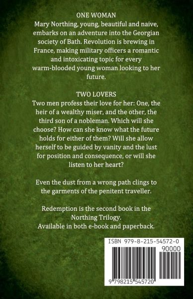 ONE WOMAN Mary Northing, young, beautiful and naive, embarks on an adventure into the Georgian society of Bath. Revolution is brewing in France, making military officers a romantic and intoxicating topic for every warm-blooded young woman looking to her future. TWO LOVERS Two men profess their love for her: One, the heir of a wealthy miser, and the other, the third son of a nobleman. Which will she choose? How can she know what the future holds for either of them? Will she allow herself to be guided by vanity and the lust for position and consequence, or will she listen to her heart? Even the dust of a wrong path clings to the garments of the penitent traveller.