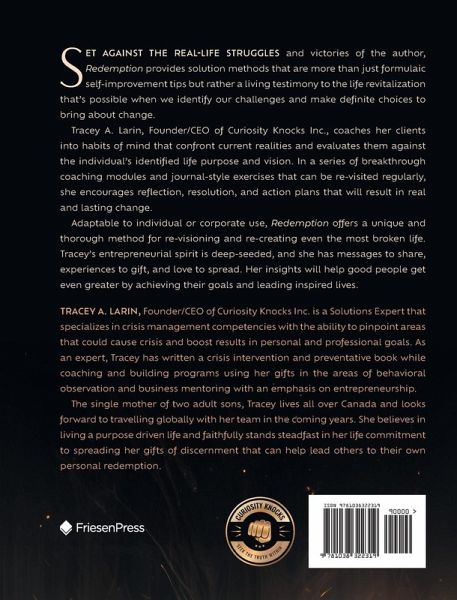 Set against the real-life struggles and victories of the author, Redemption provides solution methods that are more than just formulaic self-improvement tips but rather a living testimony to the life revitalization that's possible when we identify our challenges and make definite choices to bring about change. Tracey A. Larin, Founder/CEO of Curiosity Knocks Inc., coaches her clients into habits of mind that confront current realities and evaluates them against the individual's identified life purpose and vision. In a series of breakthrough coaching modules and journal-style exercises that can be re-visited regularly, she encourages reflection, resolution, and action plans that will result in real and lasting change. Adaptable to individual or corporate use, Redemption offers a unique and thorough method for re-visioning and re-creating even the most broken life. Tracey's entrepreneurial spirit is deep- seeded, and she has messages to share, experiences to gift, and love to spread. Her insights will help good people get even greater by achieving their goals and leading inspired lives.