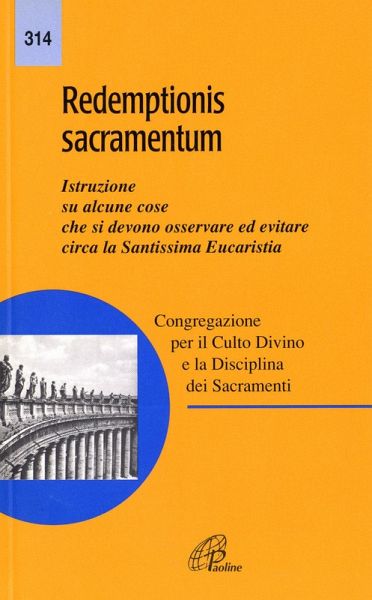 Serie di indicazioni, da parte della Congregazione per il Culto divino e la disciplina dei sacramenti, sulla partecipazione dei fedeli laici alla celebrazione dell'Eucarestia, sulla celebrazione della Santa Messa da parte dei sacerdoti, sulla santa Comunione e il culto all'Eucaristia fuori della Messa. Il documento mette in guardia da tutta una serie di possibili abusi. Das Urheberrecht an bibliographischen und produktbeschreibenden Daten und an den bereitgestellten Bildern liegt bei Informazioni Editoriali, I.E. S.r.l., oder beim Herausgeber oder demjenigen, der die Genehmigung erteilt hat. Alle Rechte vorbehalten.