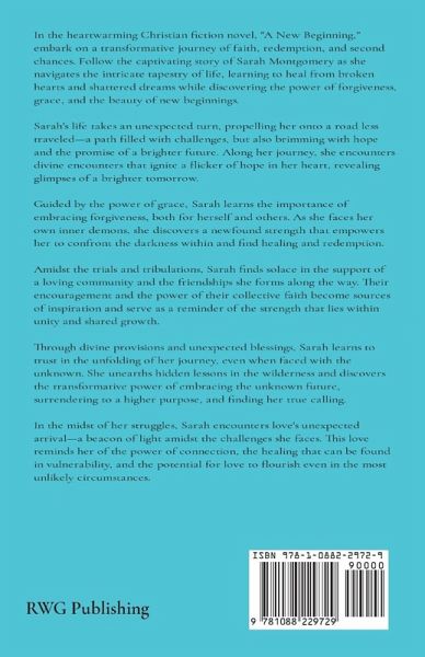 In the heartwarming Christian fiction novel, "A New Beginning," embark on a transformative journey of faith, redemption, and second chances. Follow the captivating story of Sarah Montgomery as she navigates the intricate tapestry of life, learning to heal from broken hearts and shattered dreams while discovering the power of forgiveness, grace, and the beauty of new beginnings. Sarah's life takes an unexpected turn, propelling her onto a road less traveled-a path filled with challenges, but also brimming with hope and the promise of a brighter future. Along her journey, she encounters divine encounters that ignite a flicker of hope in her heart, revealing glimpses of a brighter tomorrow. Guided by the power of grace, Sarah learns the importance of embracing forgiveness, both for herself and others. As she faces her own inner demons, she discovers a newfound strength that empowers her to confront the darkness within and find healing and redemption. Amidst the trials and tribulations, Sarah finds solace in the support of a loving community and the friendships she forms along the way. Their encouragement and the power of their collective faith become sources of inspiration and serve as a reminder of the strength that lies within unity and shared growth. Through divine provisions and unexpected blessings, Sarah learns to trust in the unfolding of her journey, even when faced with the unknown. She unearths hidden lessons in the wilderness and discovers the transformative power of embracing the unknown future, surrendering to a higher purpose, and finding her true calling. In the midst of her struggles, Sarah encounters love's unexpected arrival-a beacon of light amidst the challenges she faces. This love reminds her of the power of connection, the healing that can be found in vulnerability, and the potential for love to flourish even in the most unlikely circumstances. Throughout the book, Sarah grapples with her faith, testing its boundaries and learning to stand firm in the face of doubt. She discovers that faith is not an escape from challenges but a source of strength and resilience that enables her to overcome the storms that threaten to consume her. "A New Beginning" is a heartfelt story that explores the power of restoration, the transformative nature of hope, and the beauty that emerges from embracing the unknown. It is a powerful reminder that, no matter the past, every day holds the potential for a new beginning-one filled with endless possibilities, growth, and the unwavering love and grace of a Higher Power. Prepare to be inspired, uplifted, and moved by this compelling Christian fiction novel that invites readers to reflect on their own journeys of faith and find solace in the message that redemption and new beginnings are always within reach.