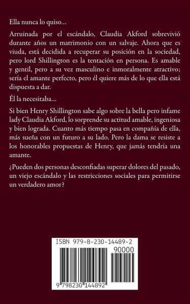 Ella nunca lo quiso... Arruinada por el escándalo, Claudia Akford sobrevivió durante años un matrimonio con un salvaje. Ahora que es viuda, está decidida a recuperar su posición en la sociedad, pero lord Shillington es la tentación en persona. Es amable y gentil, pero a su vez masculino e inmoralmente atractivo; sería el amante perfecto, pero él quiere más de lo que ella está dispuesta a dar. Él la necesitaba... Si bien Henry Shillington sabe algo sobre la bella pero infame lady Claudia Akford, lo sorprende su actitud amable, ingeniosa y bien lograda. Cuanto más tiempo pasa en compañía de ella, más sueña con un futuro a su lado. Pero la dama se resiste a los honorables propuestas de Henry, que jamás tendría una amante. ¿Pueden dos personas desconfiadas superar dolores del pasado, un viejo escándalo y las restricciones sociales para permitirse un verdadero amor?