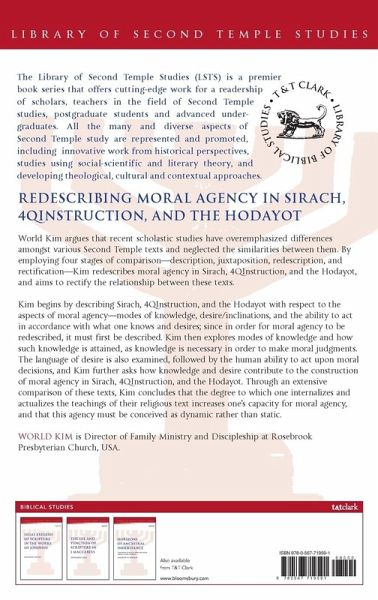 This book presents the first comprehensive comparison of how moral agency is constructed in Sirach, 4QInstruction, and the Hodayot. World Kim argues that recent scholastic studies have overemphasized differences amongst various Second Temple texts and neglected the similarities between them.By employing four stages of comparison-description, juxtaposition, re-description, and rectification- Kim re-describes moral agency in Sirach, 4QInstruction, and the Hodayot, and aims to rectify the relationship between these texts. Kim demonstrates that moral agency cannot be described by categories such as affirmation or denial, and argues that such agency should instead be described in terms of degrees and shaped by various factors such as knowledge and desire, that will either decrease or increase moral agency. Through an extensive comparison of these texts, Kim concludes that the degree to which one internalizes and actualizes the teachings of their religious text increases one's capacity for moral agency, and that this agency must be conceived as dynamic rather than static.