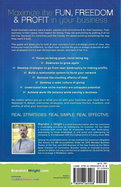 Small business owners have a heart, passion and commitment for their business. Their business is their cause, their reason for being. They risk everything by putting it all on the line, because it's more than just the money. It's about building something the way they want it built. This guide will allow you to look at your business from a strategic point of view. You know you must be different, so start now. Live the life you've always dreamed of with real strategies from a real-life business owner who tells it like it is. Focus on being great; resist being big Downsize to grow again Develop strategies to go from near-bankruptcy to making profits Build a relationship system to build your network Remove the crushing effect of debt Develop a sales culture of giving Understand how niche markets are untapped potential Achieve work-life balance while owning a business No matter where you go or what you do with your business, you must learn to ReDesign it. Adapt, overcome, strategize, and maximize the fun, freedom, and profits of what your business could be.