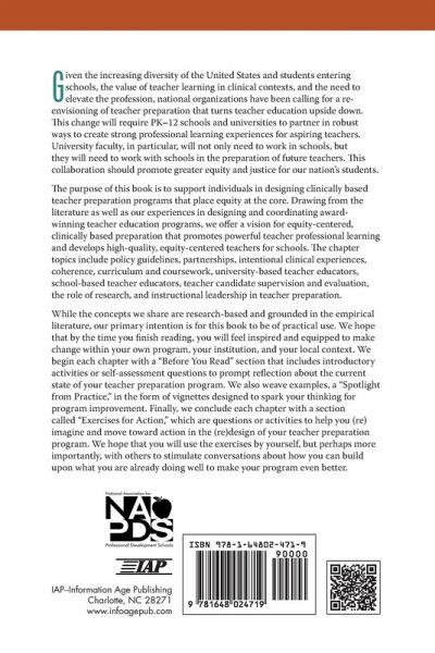 Given the increasing diversity of the United States and students entering schools, the value of teacher learning in clinical contexts, and the need to elevate the profession, national organizations have been calling for a re-envisioning of teacher preparation that turns teacher education upside down. This change will require PK-12 schools and universities to partner in robust ways to create strong professional learning experiences for aspiring teachers. University faculty, in particular, will not only need to work¿in¿schools, but they will need to work¿with¿schools in the preparation of future teachers. This collaboration should promote greater equity and justice for our nation's students. The purpose of this book is to support individuals in designing clinically based teacher preparation programs that place equity at the core. Drawing from the literature as well as our experiences in designing and coordinating award-winning teacher¿education programs, we offer a vision for equity-centered, clinically based preparation that promotes powerful teacher professional learning and develops high-quality, equity-centered teachers for schools. The chapter topics include policy guidelines, partnerships, intentional clinical experiences, coherence, curriculum and coursework, university-based teacher educators, school-based teacher educators, teacher candidate supervision and evaluation, the role of research, and instructional leadership in teacher preparation. While the concepts we share are research-based and grounded in the empirical literature, our primary intention is for this book to be of practical use. We hope that by the time you finish reading, you will feel inspired and equipped to make change within your own program, your institution, and your local context. We begin each chapter with a "Before You Read" section that includes introductory activities or self-assessment questions to prompt reflection about the current state of your teacher preparation program. We also weave examples, a "Spotlight from Practice," in the form of vignettes designed to spark your thinking for program improvement. Finally, we conclude each chapter with a section called "Exercises for Action," which are questions or activities to help you (re)imagine and move toward action in the (re)design of your teacher preparation program. We hope that you will use the exercises by yourself, but perhaps more importantly, with others to stimulate conversations about how you can build upon what you are already doing well to make your program even better.