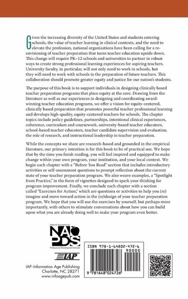 Given the increasing diversity of the United States and students entering schools, the value of teacher learning in clinical contexts, and the need to elevate the profession, national organizations have been calling for a re-envisioning of teacher preparation that turns teacher education upside down. This change will require PK-12 schools and universities to partner in robust ways to create strong professional learning experiences for aspiring teachers. University faculty, in particular, will not only need to work¿in¿schools, but they will need to work¿with¿schools in the preparation of future teachers. This collaboration should promote greater equity and justice for our nation's students. The purpose of this book is to support individuals in designing clinically based teacher preparation programs that place equity at the core. Drawing from the literature as well as our experiences in designing and coordinating award-winning teacher¿education programs, we offer a vision for equity-centered, clinically based preparation that promotes powerful teacher professional learning and develops high-quality, equity-centered teachers for schools. The chapter topics include policy guidelines, partnerships, intentional clinical experiences, coherence, curriculum and coursework, university-based teacher educators, school-based teacher educators, teacher candidate supervision and evaluation, the role of research, and instructional leadership in teacher preparation. While the concepts we share are research-based and grounded in the empirical literature, our primary intention is for this book to be of practical use. We hope that by the time you finish reading, you will feel inspired and equipped to make change within your own program, your institution, and your local context. We begin each chapter with a "Before You Read" section that includes introductory activities or self-assessment questions to prompt reflection about the current state of your teacher preparation program. We also weave examples, a "Spotlight from Practice," in the form of vignettes designed to spark your thinking for program improvement. Finally, we conclude each chapter with a section called "Exercises for Action," which are questions or activities to help you (re)imagine and move toward action in the (re)design of your teacher preparation program. We hope that you will use the exercises by yourself, but perhaps more importantly, with others to stimulate conversations about how you can build upon what you are already doing well to make your program even better.