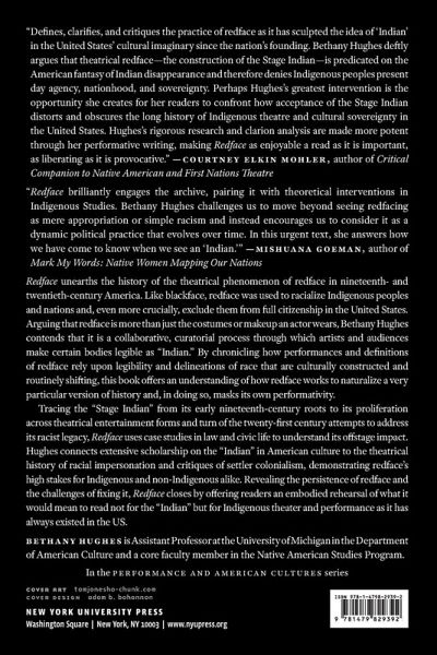 Considers the character of the "Stage Indian" in American theater and its racial and political impact Redface unearths the history of the theatrical phenomenon of redface in nineteenth- and twentieth-century America. Like blackface, redface was used to racialize Indigenous peoples and nations, and even more crucially, exclude them from full citizenship in the United States. Arguing that redface is more than just the costumes or makeup an actor wears, Bethany Hughes contends that it is a collaborative, curatorial process through which artists and audiences make certain bodies legible as "Indian." By chronicling how performances and definitions of redface rely upon legibility and delineations of race that are culturally constructed and routinely shifting, this book offers an understanding of how redface works to naturalize a very particular version of history and, in doing so, mask its own performativity. Tracing the "Stage Indian" from its early nineteenth-century roots to its proliferation across theatrical entertainment forms and turn of the twenty-first century attempts to address its racist legacy, Redface uses case studies in law and civic life to understand its offstage impact. Hughes connects extensive scholarship on the "Indian" in American culture to the theatrical history of racial impersonation and critiques of settler colonialism, demonstrating redface's high stakes for Indigenous and non-Indigenous alike. Revealing the persistence of redface and the challenges of fixing it, Redface closes by offering readers an embodied rehearsal of what it would mean to read not for the "Indian" but for Indigenous theater and performance as it has always existed in the US.