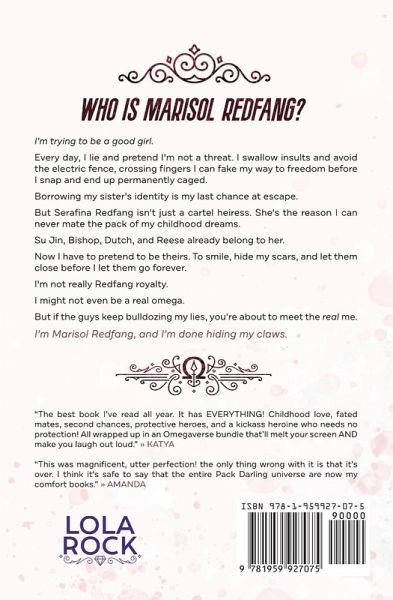 Sink your teeth into the newest alphas from the USA Today Bestselling world of Pack Darling. I'm trying to be a good girl. Every day, I lie and pretend I'm not a threat. I swallow insults and avoid the electric fence, crossing fingers I can fake my way to freedom before I snap and end up permanently caged. Borrowing my sister's identity is my last chance at escape. But Serafina Redfang isn't just a cartel heiress. She's the reason I can never mate the pack of my childhood dreams. Su Jin, Bishop, Dutch, and Reese already belong to her. Now I have to pretend to be theirs. To smile, hide my scars, and let them close before I let them go forever. I'm not really Redfang royalty. I might not even be a real omega. But if the guys keep bulldozing my lies, you're about to meet the real me. I'm Marisol Redfang, and I'm done hiding my claws. *Vibe check* Redfang Royal is a whychoose romance, dripping in swearing, spice, and sword-crossing. Snuggle up with Pack Darling: Pack Darling, Part 1 Pack Darling, Part 2 Pack Darling Extended Ending Redfang Royal