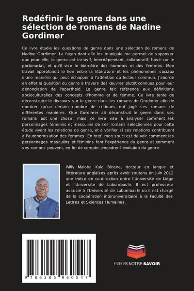 Ce livre étudie les questions de genre dans une sélection de romans de Nadine Gordimer. La façon dont elle les manipule me permet de supposer que pour elle, le genre est inclusif, interdépendant, collaboratif, basé sur le partenariat, et qu'il vise le bien-être des hommes et des femmes. Mon travail approfondit le lien entre la littérature et les phénomènes sociaux d'une manière qui peut échapper à l'attention du lecteur commun. J'aborde en effet la question du genre à travers des oeuvres plutôt connues pour leur dénonciation de l'apartheid. Le genre fait référence aux définitions socioculturelles des concepts d'homme et de femme. Ce livre tente de déconstruire le discours sur le genre dans les romans de Gordimer afin de montrer qu'un certain nombre de critiques ont jugé ses romans de différentes manières. Que Gordimer ait déconstruit le genre dans ses romans est une chose, mais ce livre vise à analyser comment les personnages féminins et masculins de ses romans sélectionnés pour cette étude vivent les relations de genre, et à vérifier si ces relations contribuent à l'autonomisation des femmes. En bref, mon souci est de voir comment les personnages masculins et féminins font l'expérience du genre et comment ses romans peuvent, en fin de compte, encadrer l'évolution du genre.
