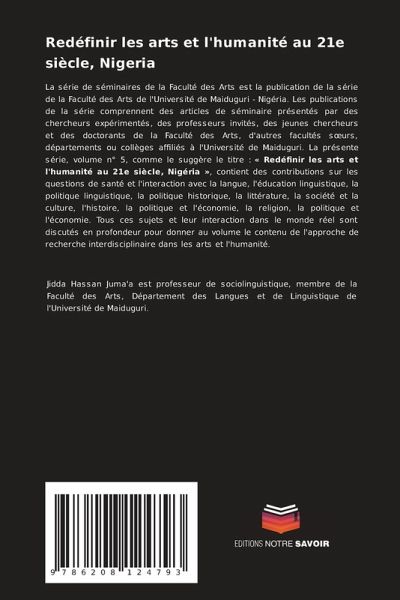 La série de séminaires de la Faculté des Arts est la publication de la série de la Faculté des Arts de l'Université de Maiduguri - Nigéria. Les publications de la série comprennent des articles de séminaire présentés par des chercheurs expérimentés, des professeurs invités, des jeunes chercheurs et des doctorants de la Faculté des Arts, d'autres facultés soeurs, départements ou collèges affiliés à l'Université de Maiduguri. La présente série, volume n° 5, comme le suggère le titre : « Redéfinir les arts et l'humanité au 21e siècle, Nigéria », contient des contributions sur les questions de santé et l'interaction avec la langue, l'éducation linguistique, la politique linguistique, la politique historique, la littérature, la société et la culture, l'histoire, la politique et l'économie, la religion, la politique et l'économie. Tous ces sujets et leur interaction dans le monde réel sont discutés en profondeur pour donner au volume le contenu de l'approche de recherche interdisciplinaire dans les arts et l'humanité.