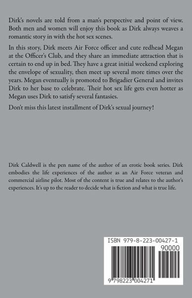 Dirk's novels are told from a man's perspective and point of view. Both men and women will enjoy this book as Dirk always weaves a romantic story in with the hot sex scenes. In this story, Dirk meets Air Force officer and cute redhead Megan at the Officer's Club, and they share an immediate attraction that is certain to end up in bed. They have a great initial weekend exploring the envelope of sexuality, then meet up several more times over the years. Megan eventually is promoted to Brigadier General and invites Dirk to her base to celebrate. Their hot sex life gets even hotter as Megan uses Dirk to satisfy several fantasies. Don't miss this latest installment of Dirk's sexual journey!