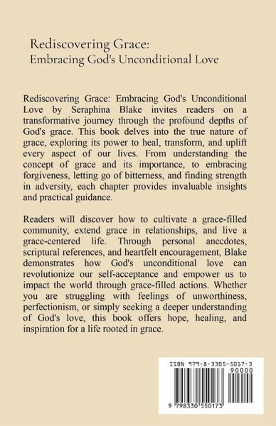 Rediscovering Grace: Embracing God's Unconditional Love by Seraphina Blake invites readers on a transformative journey through the profound depths of God's grace. This book delves into the true nature of grace, exploring its power to heal, transform, and uplift every aspect of our lives. From understanding the concept of grace and its importance, to embracing forgiveness, letting go of bitterness, and finding strength in adversity, each chapter provides invaluable insights and practical guidance. Readers will discover how to cultivate a grace-filled community, extend grace in relationships, and live a grace-centered life. Through personal anecdotes, scriptural references, and heartfelt encouragement, Blake demonstrates how God's unconditional love can revolutionize our self-acceptance and empower us to impact the world through grace-filled actions. Whether you are struggling with feelings of unworthiness, perfectionism, or simply seeking a deeper understanding of God's love, this book offers hope, healing, and inspiration for a life rooted in grace.