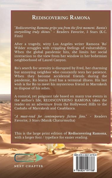 "Rediscovering Ramona grips you from the first moment. Banta's storytelling truly shines." - Readers Favorite, 5 Stars (K.C. Finn) After a tragedy, witty Los Angeles writer Ramona 'Ro' Wilder struggles with crippling feelings of vulnerability. When the global pandemic hits, she limits her social interaction to the view from her window in her bohemian neighborhood of Laurel Canyon. Ro's search for serenity is disrupted by Fred, her charming but annoying neighbor who constantly tests her patience. When they become accidental friends during the pandemic, Ro learns Fred has a terminal illness. His last wish is for Ro to meet his mysterious friend in Marrakesh to dispose of his ashes. A comical, yet poignant tale based on many true events in the author's life, REDISCOVERING RAMONA takes the reader on an adventure from the Hollywood Hills to the Casbahs of Marrakesh and Casablanca. "A must-read for contemporary fiction fans." - Readers Favorite, 5 Stars (Manik Chaturmutha) This is the large print edition of Rediscovering Ramona, with a larger font / typeface for easier reading.