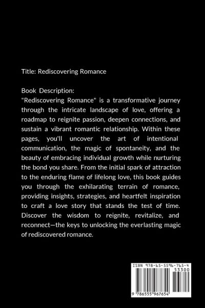 Title: Rediscovering Romance Book Description: "Rediscovering Romance" is a transformative journey through the intricate landscape of love, offering a roadmap to reignite passion, deepen connections, and sustain a vibrant romantic relationship. Within these pages, you'll uncover the art of intentional communication, the magic of spontaneity, and the beauty of embracing individual growth while nurturing the bond you share. From the initial spark of attraction to the enduring flame of lifelong love, this book guides you through the exhilarating terrain of romance, providing insights, strategies, and heartfelt inspiration to craft a love story that stands the test of time. Discover the wisdom to reignite, revitalize, and reconnect-the keys to unlocking the everlasting magic of rediscovered romance.