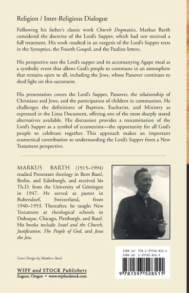 Following his father's classic work CHURCH DOGMATICS, Markus Barth considered the doctrine of the Lord's Supper, which, had not received a full treatment. His work resulted in an exegesis of the Lord's Supper texts in the Synoptics, the Fourth Gospel, and the Pauline letters. His perspective sees the Lord's supper and its accomanying Agape meal as a symbolic event that allows God's people to commune in an atmosphere that remains open to all, including the Jews, whose Passover continues to shed light on this sacrament. His presentation covers the Lord's Supper, Passover, the relationship of Christians and Jews, and the participation of children in communion. He challenges the definitions of Baptism, Eucharist, and Ministry as expressed in the Lima Document, offering one of the most sharply stated alternatives available. His discussion provides a reexamination of the Lord's Supper as a symbol of ecumenism--the opportunity for all God's people to celebrate together. This approach makes an important ecumenical contribution to understanding the Lord's Supper from a New Testament perspective.