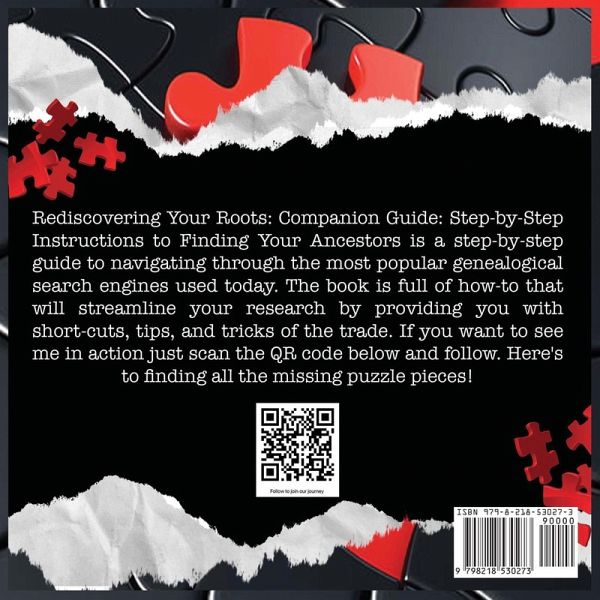 Rediscovering Your Roots: Companion Guide: Step-by-Step Instructions to Finding Your Ancestors is a step-by-step guide to navigating through the most popular genealogical search engines used today. The book is full of how-to that will streamline your research by providing you with short-cuts, tips, and tricks of the trade. If you want to see me in action just scan the QR code below and follow. Here's to finding all the missing puzzle pieces!