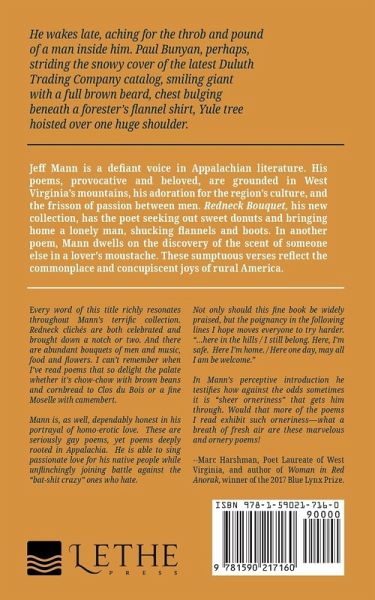 Jeff Mann is a defiant voice in Appalachian literature. His poems, provocative and beloved, are grounded in West Virginia's mountains, his adoration for the region's culture, and the frisson of passion between men. Redneck Bouquet, his new collection, has the poet seeking out sweet donuts and bringing home a lonely man, shucking flannels and boots. In another poem, Mann dwells on the scent of someone else in a lover's moustache. These sumptuous verses reflect the commonplace and concupiscent joys of rural America.