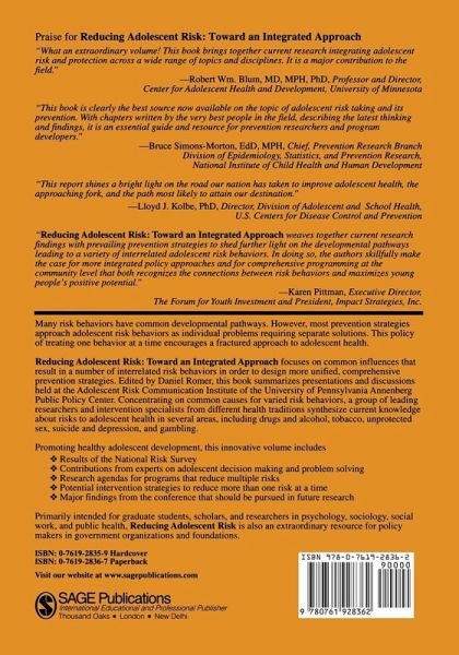 Reducing Adolescent Risk: Toward an Integrated Approach focuses on common influences that result in a number of interrelated risk behaviors in order to design more unified, comprehensive prevention strategies. Edited by Daniel Romer, this book summarizes presentations and discussions held at the Adolescent Risk Communication Institute of the University of Pennsylvania Annenberg Public Policy Center. Concentrating on common causes for varied risk behaviors, a group of leading researchers and intervention specialists from different health traditions synthesize current knowledge about risks to adolescent health in several areas, including drugs and alcohol, tobacco, unprotected sex, suicide and depression, and gambling. Primarily intended for graduate students, scholars, and researchers in psychology, sociology, social work, and public health, Reducing Adolescent Risk is also an extraordinary resource for policy makers in government organizations and foundations.