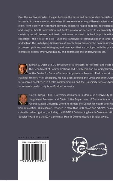 Contents: Mohan J. Dutta/Gary L. Kreps: Reducing Health Disparities: Communication Interventions - Ashley P. Duggan/Ylisabyth S. Bradshaw: Shifting Communication Challenges to Education and Reflective Practice: Communication to Reduce Disparities Toward Patients With Disabilities - Elaine Hsieh: Health Literacy and Patient Empowerment: The Role of Medical Interpreters in Bilingual Health Communication - Melinda R. Weathers/Gina Castle Bell: Assessing Health Disparities Through Communication Competence, Social Support, and Coping Among Hispanic Lay Caregivers for Loved Ones With Alzheimer's Disease - Christina Jones/Mohan J. Dutta: Culture-Centered Constructions Among Health Providers in Rural Indiana: Setting Agendas for Interventions - Tamar Ginossar: Promoting Women Leadership as a Strategy for Reducing Health and Digital Disparities in Latino/a Immigrant Communities - Patrick J. Dillon/Ambar Basu: Preventing HIV/AIDS Through a Culture-Centered Health Campaign: The Sonagachi HIV/AIDS Intervention Program - Nurit Guttman/Anat Jaffe/Seffefe Aycheh: Challenges and Dilemmas in Developing Health Communication Programs for Ethiopian Immigrants in Israel: The Tene Briut Health Promotion Organization - Elisia L. Cohen/Robin C. Vanderpool/Rick Crosby/Seth M. Noar/Wallace Bates/Tom Collins/Katharine J. Head/Margaret McGladrey/Baretta Casey: 1-2-3 Pap: A Campaign to Prevent Cervical Cancer in Eastern Kentucky - Torill Bull/Maurice B. Mittelmark/Peter Sanbian Gmatieyindu: Vulnerable Old Women of Northern Ghana at Risk of Being Ostracized for Witchcraft: How Wise Village Leadership Brings Them Back From the Brink - Robin Kelly/Al Hannans/Gary L. Kreps: A Case Study of the Community Liaison Pilot Program: A Culturally Oriented, Participatory Pilot Health Education and Communication Program to Decrease Disparities in Minority HIV Vaccine Trial Participation - Gary L. Kreps/Melinda M. Villagran/Janey Trowbridge/Paula Baldwin/Yolanda Barbier/Amy Chang/Jung-mi Jun/Megan Tucker/Autumn Saxton-Ross/Sieglinde Friedman: Evaluation of the Influence of an Urban Community Park Revitalization on African American Youth Physical Activity - Muhiuddin Haider/Nicole I. Wanty: Reducing Health Disparities Using Health-Communication Interventions and Community Engagement - Deborah S. Ballard-Reisch/Rick McNary/Pamela O'Neal/Ashley Archiopoli/Bobby Rozzell/Melissa Granville/Alyssa Ballard-Reisch: Numana Feeds Haiti: A Case Study of a Grassroots, Community-Based Social Movement to "Save the Starving" - Elisia L. Cohen/Charlene A. Caburnay/Jon Stemmle/María Len-Ríos/Tim Poor/Barbara Powe/Susie Rath/Erin Robinson/Katharine Semenkovich/Glen T. Cameron/Douglas A. Luke/Matthew W. Kreuter: The Ozioma News Service: Targeting Cancer Communication to African American Communities - Kathryn Greene/Smita C. Banerjee: Reducing Smoking Disparities for Hispanic Adolescents: Empowerment Through Media Literacy - Sarah Diamond/Leslie Snyder/Jean J. Schensul: Preventing Substance Use Among Multiethnic Urban Teens Using Education Entertainment, Social Marketing, and Peer Content - Ann Neville Miller/Julie Gathoni Muraya/Ann Muthoni-Thuo/Leonard Mjomba: The Importance of Formative Research in Mass-Media Campaigns Addressing Health Disparities: Two Kenyan Case Studies - David B. Buller/W. Gill Woodall: 5 a Day, the Rio Grande Way: Internet Intervention and Health Inequities in the Upper Rio Grande Valley - Kevin B. Wright: Comprehensive Care Center and Computer-Mediated Support Group Approaches to Targeting Health Disparities: Two Case Studies - Fiona McTavish/Helene McDowell/David Gustafson: How e-Health Systems Can Help the Medically Underserved - Rebecca de Souza: The Business of Doing Interventions: A