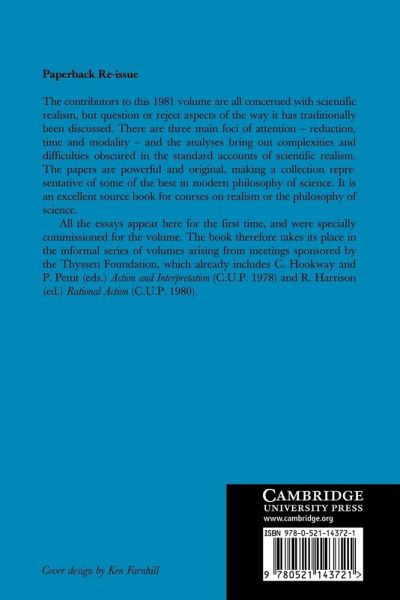 The contributors to this 1981 volume are all concerned with scientific realism, but each author questions or rejects aspects of the way it has traditionally been discussed. There are three main foci of attention - reduction, time and modality - and the analyses bring out complexities and difficulties obscured in the standard accounts of scientific realism. The papers are powerful and original, representing some of the best in modern philosophy of science, and each were specifically commissioned for the volume. It is an excellent source book for courses on realism or the philosophy of science. The book therefore takes its place in the informal series of volumes arising from meetings sponsored by the Thyssen Foundation, which already includes C. Hookway and P. Pettit (eds.) Action and Interpretation (C. U. P. 1978) and R. Harrison (ed.) Rational Action (C. U. P. 1980).