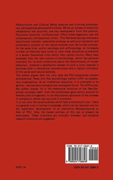 1 Statement of the argument: Philosophical orientation and the theoretical framework for critique.- 1 Introduction: The statement of the overall argument.- 2 Rebuttal of the methodological criticism of the argumentative structure of the work.- 2 Philosophico-methodological reductionism: The alleged case against Culturology.- 1 Introductory statement of the argument: Culturology and the idea of a philosophico-methodological reduction.- 2 Systematizing the critique.- 3 Monistic-Systemic Perspectivism and the "crisis of Sociology".- 4 A response to the Ellis-Skinner critique of the fundamental assumption of Culturology.- 5 Conclusion: The state of the argument.- 3 Theoretical reductionism and physicalist scientific unificationism: The case against.- 1 Introductory statement of the argument.- 2 The Weltanschauung of Physicalist Scientific Unificationism.- 3 Systematizing the argument: Sociobiology and PSU.- 4 Culturology, sociobiology and theoretical reduction.- 5 Unification without reduction; Philosophy without physicalism.- 6 Conclusion: The state of the argument.- 4 Causal-explanatory reductionism I: A philosophico-biological critique of Sociobiology.- 1 Introductory state of the argument.- 2 The theoretical foundations of the neo-Darwinist synthesis and an explanation of the theoretical structure of sociobiology.- 3 Towards a critique of Sociobiology.- 4 Conclusion: The state of the argument.- 5 Causal-explanatory reductionism II: The metaphysics of the selfish gene.- 1 Introductory state of the argument.- 2 The nature of the gene: Mendelian genetics, quantitative genetics and molecular biology.- 3 Beyond neo-Darwinism: The search for a new science of life.- 4 Conclusion: The state of the argument.- 6 Causal-explanatory reductionism III: Neuroendocrinologicalreductionism and the rationality of the foundations of feminist social theory.- 1 Introductory state of the argument.- 2 Initial outline of the (NECER) positions.- 3 The conceptual and biological background.- 4 A critique of the positions.- 5 Scepticism about sex-related cognitive differences.- 6 General conclusion: The state of the argument.- 7 Causal-explanatory reductionism IV: Ecological Sociobiology and cultural materialism.- 1 Introductory statement of the argument.- 2 Central theoretical presuppositions of Emlen's Ecological Sociobiology.- 3 A critique of Ecological Sociobiology.- 4 Harris' cultural materialism: An exposition.- 5 The case against Cultural Materialism.- 6 Conclusion: The state of the argument.- 8 Reductionism and cultural being: Beings, agents, mentalities, persons and societies in the universe.- 1 Introductory state of the argument.- 2 Culturology and models of human nature.- 3 Culturology, innateness and the human essence.- 4 Culturology defined and defended: Beings, agents, mentalities, persons and societies in the universe.- 5 Conclusion: The state of the argument.- Conclusion: The state of the overall argument of the work.- Appendix 1: Sociobiology and ideology.- Appendix 2: A critique of Alexander Rosenberg's Sociobiology and the preemption of social science.- Notes.