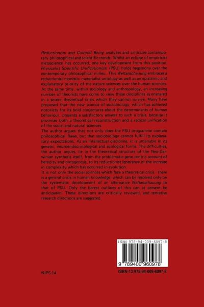 1 Statement of the argument: Philosophical orientation and the theoretical framework for critique.- 1 Introduction: The statement of the overall argument.- 2 Rebuttal of the methodological criticism of the argumentative structure of the work.- 2 Philosophico-methodological reductionism: The alleged case against Culturology.- 1 Introductory statement of the argument: Culturology and the idea of a philosophico-methodological reduction.- 2 Systematizing the critique.- 3 Monistic-Systemic Perspectivism and the "crisis of Sociology".- 4 A response to the Ellis-Skinner critique of the fundamental assumption of Culturology.- 5 Conclusion: The state of the argument.- 3 Theoretical reductionism and physicalist scientific unificationism: The case against.- 1 Introductory statement of the argument.- 2 The Weltanschauung of Physicalist Scientific Unificationism.- 3 Systematizing the argument: Sociobiology and PSU.- 4 Culturology, sociobiology and theoretical reduction.- 5 Unification without reduction; Philosophy without physicalism.- 6 Conclusion: The state of the argument.- 4 Causal-explanatory reductionism I: A philosophico-biological critique of Sociobiology.- 1 Introductory state of the argument.- 2 The theoretical foundations of the neo-Darwinist synthesis and an explanation of the theoretical structure of sociobiology.- 3 Towards a critique of Sociobiology.- 4 Conclusion: The state of the argument.- 5 Causal-explanatory reductionism II: The metaphysics of the selfish gene.- 1 Introductory state of the argument.- 2 The nature of the gene: Mendelian genetics, quantitative genetics and molecular biology.- 3 Beyond neo-Darwinism: The search for a new science of life.- 4 Conclusion: The state of the argument.- 6 Causal-explanatory reductionism III: Neuroendocrinologicalreductionism and the rationality of the foundations of feminist social theory.- 1 Introductory state of the argument.- 2 Initial outline of the (NECER) positions.- 3 The conceptual and biological background.- 4 A critique of the positions.- 5 Scepticism about sex-related cognitive differences.- 6 General conclusion: The state of the argument.- 7 Causal-explanatory reductionism IV: Ecological Sociobiology and cultural materialism.- 1 Introductory statement of the argument.- 2 Central theoretical presuppositions of Emlen's Ecological Sociobiology.- 3 A critique of Ecological Sociobiology.- 4 Harris' cultural materialism: An exposition.- 5 The case against Cultural Materialism.- 6 Conclusion: The state of the argument.- 8 Reductionism and cultural being: Beings, agents, mentalities, persons and societies in the universe.- 1 Introductory state of the argument.- 2 Culturology and models of human nature.- 3 Culturology, innateness and the human essence.- 4 Culturology defined and defended: Beings, agents, mentalities, persons and societies in the universe.- 5 Conclusion: The state of the argument.- Conclusion: The state of the overall argument of the work.- Appendix 1: Sociobiology and ideology.- Appendix 2: A critique of Alexander Rosenberg's Sociobiology and the preemption of social science.- Notes.