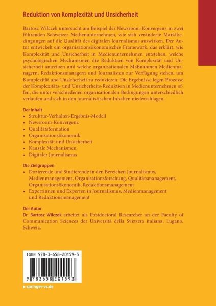 Bartosz Wilczek untersucht am Beispiel der Newsroom-Konvergenz in zwei führenden Schweizer Medienunternehmen, wie sich veränderte Marktbedingungen auf die Qualität des digitalen Journalismus auswirken. Der Autor entwickelt ein organisationsökonomisches Framework, das erklärt, wie Komplexität und Unsicherheit in Medienunternehmen entstehen, welche psychologischen Mechanismen die Reduktion von Komplexität und Unsicherheit antreiben und welche organisationalen Maßnahmen Medienmanagern, Redaktionsmanagern und Journalisten zur Verfügung stehen, um Komplexität und Unsicherheit zu reduzieren. Die Ergebnisse legen Prozesse der Komplexitäts- und Unsicherheits-Reduktion in Medienunternehmen offen, die unter verschiedenen organisationalen Bedingungen unterschiedlich verlaufen und sich in den journalistischen Inhalten niederschlagen.