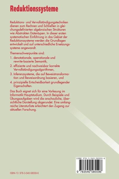 Reduktions- und Vervollständigungstechniken dienen zum Rechnen und Schließen in gleichungsdefinierten algebraischen Strukturen wie Abstrakten Datentypen. In dieser ersten systematischen Einführung in das Gebiet der Reduktionssysteme werden die Grundlagen entwickelt und auf unterschiedliche Ersetzungssysteme angewandt. Themenschwerpunkte sind: 1. denotationale, operationale und rewrite-basierte Semantik, 2. effiziente und nachweisbar korrekte Vervollständigungsalgorithmen, 3. Inferenzsysteme, die auf Beweistransformation und Beweisordnung basieren, und 4. prinzipielle Entscheidbarkeit grundlegender Eigenschaften.