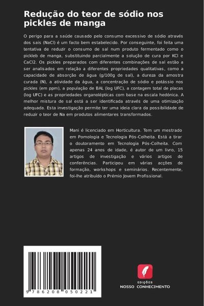 O perigo para a saúde causado pelo consumo excessivo de sódio através dos sais (NaCl) é um facto bem estabelecido. Por conseguinte, foi feita uma tentativa de reduzir o consumo de sal num produto fermentado como o pickleb de manga, substituindo parcialmente a solução de cura por KCl e CaCl2. Os pickles preparados com diferentes combinações de sal estão a ser analisados em relação a diferentes propriedades qualitativas, como a capacidade de absorção de água (g/100g de sal), a dureza da amostra curada (N), a atividade da água, a concentração de sódio e potássio nos pickles (em ppm), a população de BAL (log UFC), a contagem total de placas (log UFC) e as propriedades organolépticas com base na escala hedónica. A melhor mistura de sal está a ser identificada através de uma otimização adequada. Esta investigação permite ter uma ideia clara da possibilidade de reduzir o teor de Na em produtos alimentares transformados.