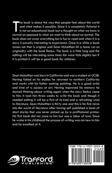 The book is about the way that people feel about the world and what makes it possible. Since it is completely fictional it is not an educational book but a thought on what we know is normal as opposed to what we want to think about as normal. The book does not cover everything but is fun to read and when it is a story is actually interesting to experience. Once in a while a book comes out that is original and Sean Mckeithen hit a home run on originality with the book Redux. The book is a little long and the editing will be interesting some times the voice fails slightly but if it is printed it will be a good book for children.