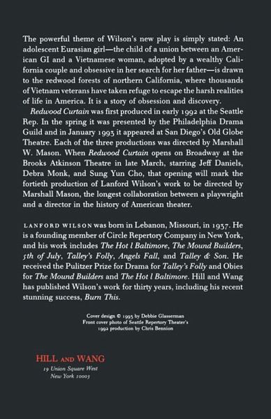 In Lanford Wilson's moving and powerful play, Redwood Curtain, an adolescent Eurasian girl-the child of a union between an American GI and a Vietnamese woman, adopted by a wealthy California couple and obsessive in her search for her father-is drawn to the redwood forests of northern California, where thousands of Vietnam veterans have taken refuge to escape the harsh realities of life in America.