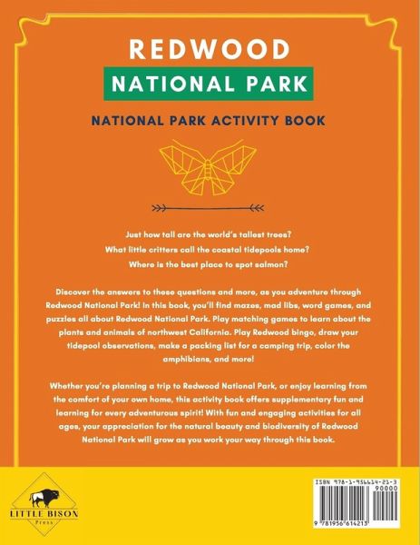 Learn about Redwood National Park and have fun at the same time! Activity book for kids ages 8 to 11. Encourage young nature lovers to learn about Redwood National Park. This book is filled with fun and educational activities like mazes, mad libs, word games, and puzzles. Play matching games about the plants and animals that live in the park. Learn about Leave No Trace principles and consider your impact on the land. Unscramble names of fish, decode clues about other national parks, make a packing list for a camping trip, and record your tidepool observations. Kids will also learn about conservation while using their imaginations to pretend they are a park ranger. This standout activity book includes: ¿ 45 pages of independent activities-Unscramble names of native species of fish, decode clues using the American Manual Alphabet (ASL), practice sound observation, color the amphibians, and more! ¿ Range of adaptable activities for anywhere-The activity pages offer complementary learning with or without a visit to California's Redwood National Park. Activities are appropriate and adaptable so all kids can start learning, no matter where they are. ¿ Important skill-building-By stopping to notice and record what's going on around them, kids will practice important skills like creative thinking, observation, writing, drawing, wilderness safety, and more. This book is great for long car rides, screen-free time, vacation, camping trips, or a trip to Redwood National Park.