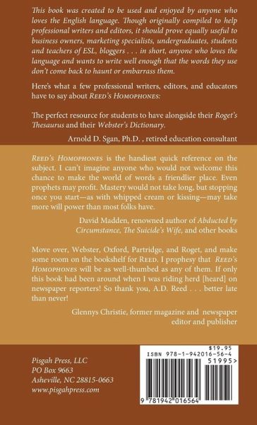 Reed's Homophones offers a serious but light-hearted overview of several thousand homophone pairs that confuse readers and writers of English. Along with an explanation of the Latin and Greek root words that are found as prefixes in hundreds of English words, the book delves into mondegreens, neologisms, odd synonyms and antonyms, and a few of the author's pet peeves, and includes a handy list of easily confused words. This book was created to be used and enjoyed by anyone who loves the English language. Though originally compiled to help professional writers and editors, it should prove equally useful to business owners, marketing specialists, undergraduates, students and teachers of ESL, bloggers . . . in short, anyone who loves the language and wants to write well enough that the words they use don't come back to haunt or embarrass them.