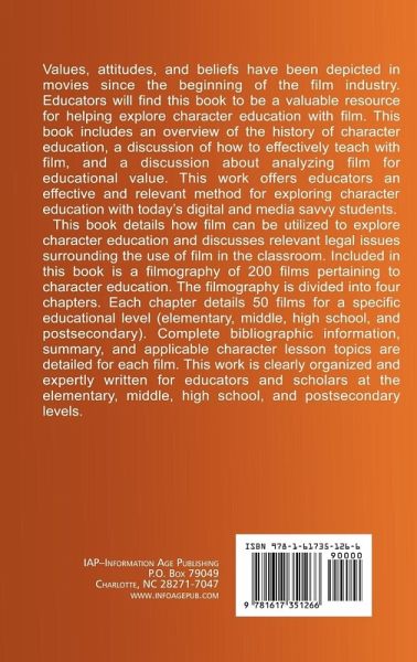 Values, attitudes, and beliefs have been depicted in movies since the beginning of the film industry. Educators will find this book to be a valuable resource for helping explore character education with film. This book includes an overview of the history of character education, a discussion of how to effectively teach with film, and a discussion about analyzing film for educational value. This book offers educators an effective and relevant method for exploring character education with today's digital and media savvy students. This book details how film can be utilized to explore character education and discusses relevant legal issues surrounding the use of film in the classroom. Included in this book is a filmography of two hundred films pertaining to character education. The filmography is divided into four chapters. Each chapter details fifty films for a specific educational level (elementary, middle, high school, and postsecondary). Complete bibliographic information, summary, and applicable character lesson topics are detailed for each film. This book is clearly organized and expertly written for educators and scholars at the elementary, middle, high school, and postsecondary levels.