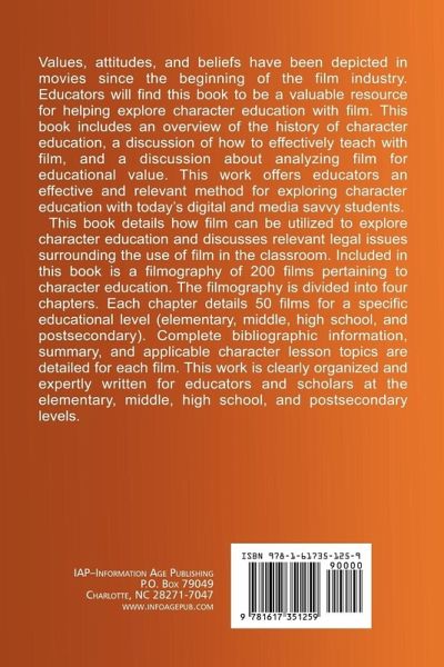 Values, attitudes, and beliefs have been depicted in movies since the beginning of the film industry. Educators will find this book to be a valuable resource for helping explore character education with film. This book includes an overview of the history of character education, a discussion of how to effectively teach with film, and a discussion about analyzing film for educational value. This book offers educators an effective and relevant method for exploring character education with today's digital and media savvy students. This book details how film can be utilized to explore character education and discusses relevant legal issues surrounding the use of film in the classroom. Included in this book is a filmography of two hundred films pertaining to character education. The filmography is divided into four chapters. Each chapter details fifty films for a specific educational level (elementary, middle, high school, and postsecondary). Complete bibliographic information, summary, and applicable character lesson topics are detailed for each film. This book is clearly organized and expertly written for educators and scholars at the elementary, middle, high school, and postsecondary levels.