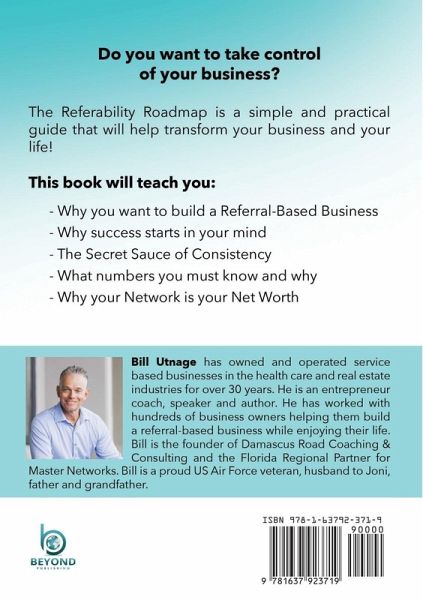 Do you want to take control of your business? The Referability Roadmap is a simple and practical guide that will help transform your business and your life!Why you want to build a Referral Based Business Why success starts in your mind The Secret Sauce of Consistency What numbers you must know and why Why your Network is your Net Worth Bill Utnage has owned and operated service based businesses in the health care and real estate industries for over 30 years. He is a coach, speaker and author. Bill is the founder of Damascus Road Coaching & Consulting and the Florida Regional Partner for Master Networks. Bill is a proud US Air Force veteran, a husband to Joni, father and grandfather.